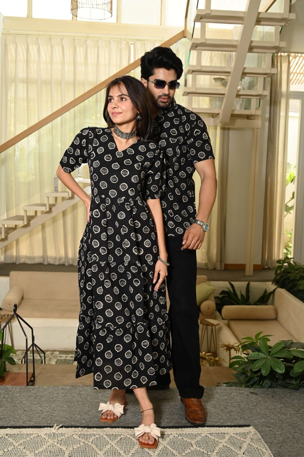 Couple Matching Black Cotton Anarkali Midi Dress and Shirt Set ? Vertical Vine Block Print