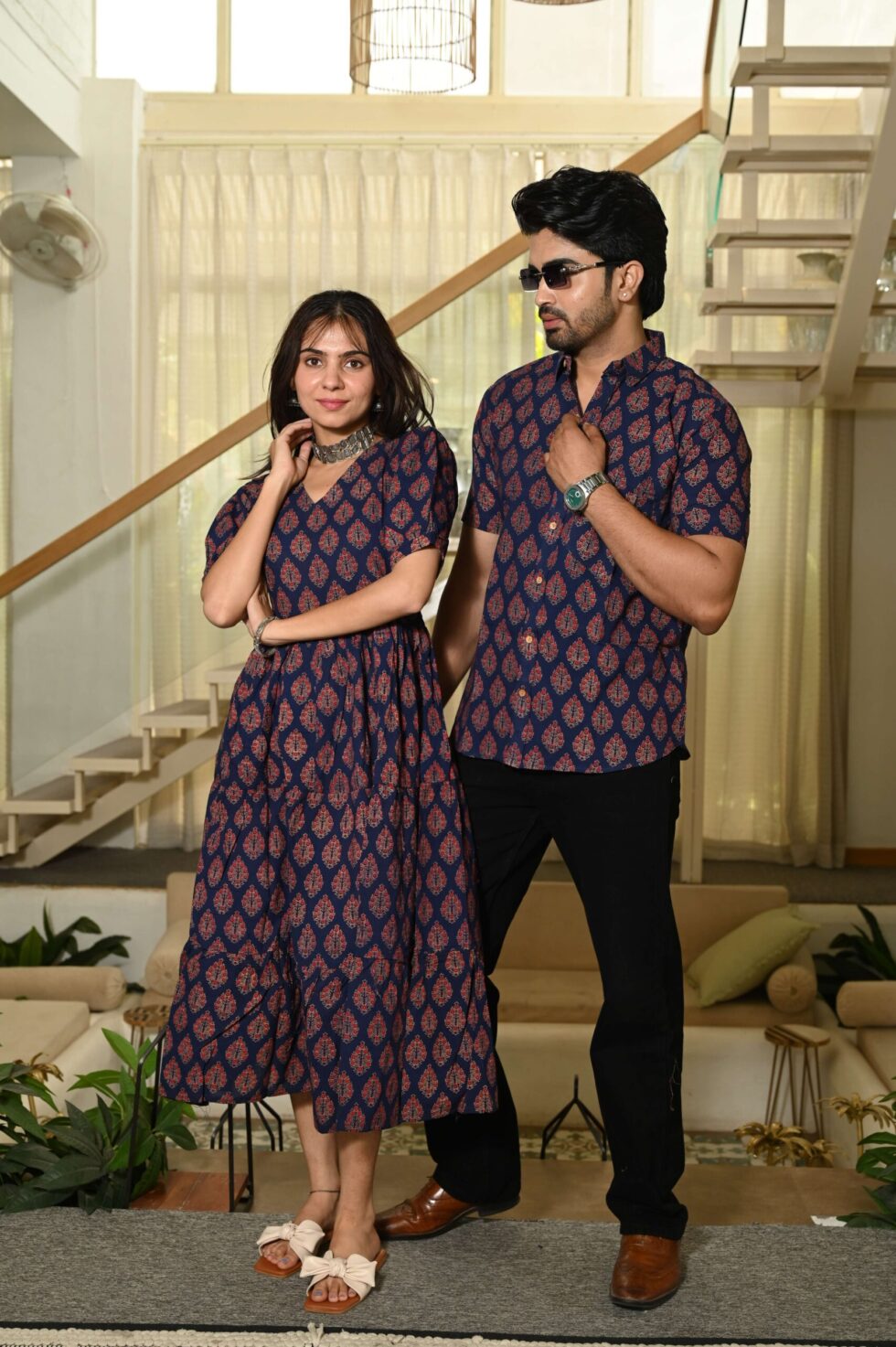 A striking navy blue cotton outfit featuring traditional red hand block prints. The women?s flared dress and men?s short-sleeved shirt create a bold yet elegant ethnic look, ideal for festivals, family gatherings, or casual wear.