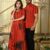 Stylish and coordinated red cotton couple outfit featuring vertical vine hand block prints. The breezy dress with a V-neck and the casual short-sleeve shirt make this a versatile duo for casual outings or festive gatherings.