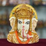 This hand-painted Marble Dust statue depicts the Hindu deity Ganesha, the elephant-headed god of wisdom and prosperity. Ganesha is traditionally worshipped at the start of any new venture, and this statue would be a perfect addition to your home or office. The statue and sits on a decorative table.